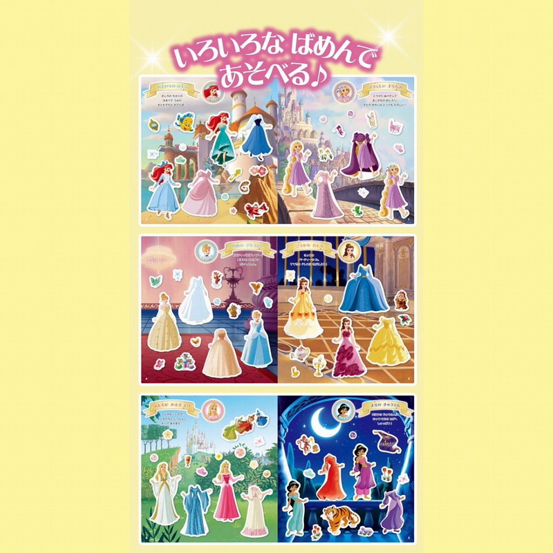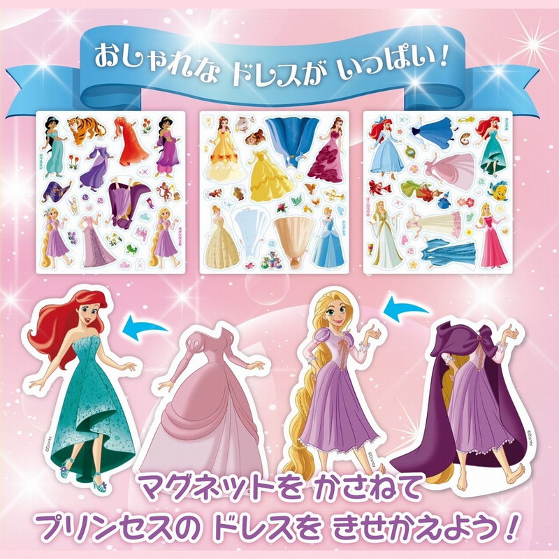 アリエル、ラプンツェル、ベル、シンデレラ、オーロラ姫、ジャスミンの6人のプリンセスとおしゃれを楽しもう♪ マグネットを貼って遊んでね♪