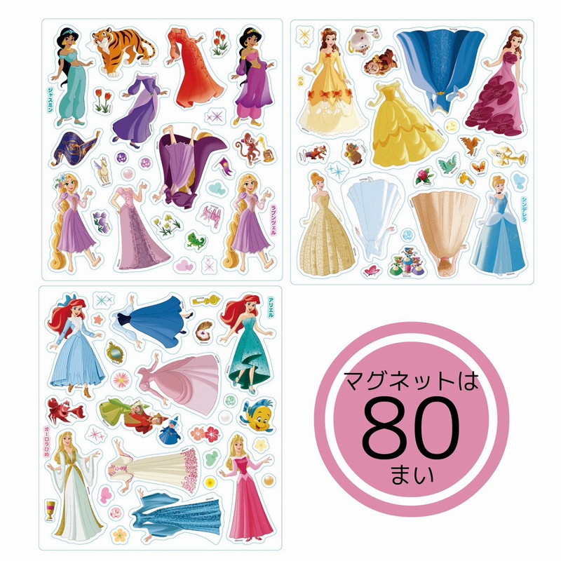 マグネットのパーツは、6人のプリンセスと、色とりどりのドレス、おともだちなど80枚収録。