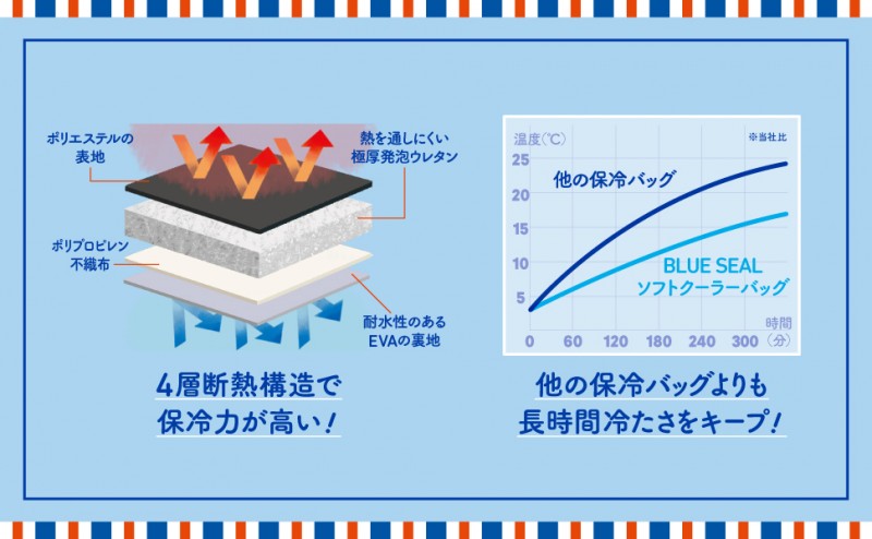 ソフトクーラーバッグは極厚の断熱素材を使用した4層構造で、機能性に優れたもの。通常の保冷バッグよりも保冷力が高く冷たさを長時間キープできます。