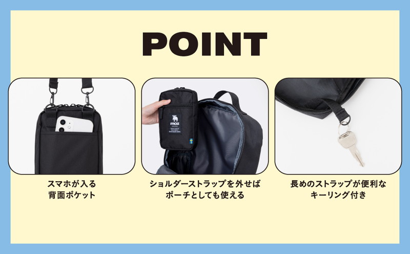 ショルダーストラップを取り外せば、ポーチとしても使用OK。用途や使用シーンによって使い分けができる2WAY仕様になっています。