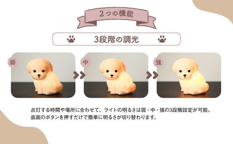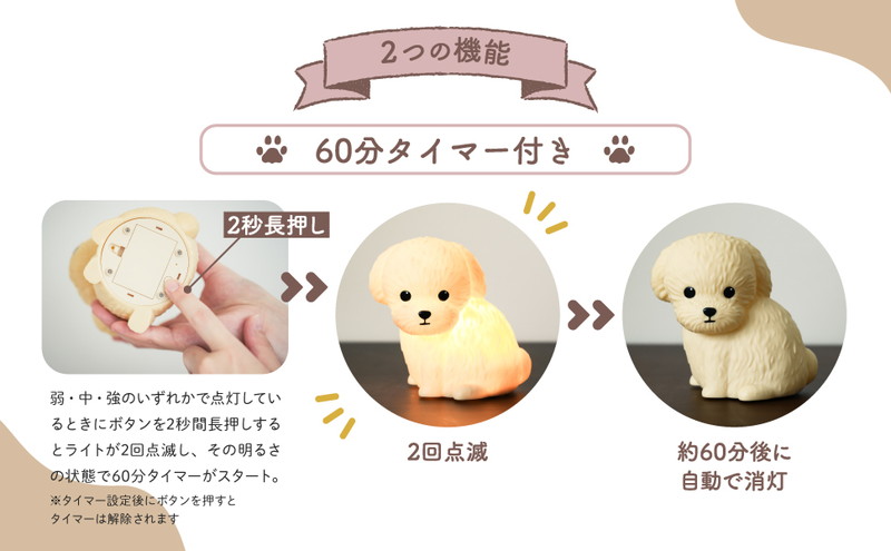 明るさは3段階に調節ができ、60分自動OFFタイマー付きで機能面も優秀です。昼も夜もいつでもかわいいトイプードルのお部屋ライトをあなたのお部屋に!