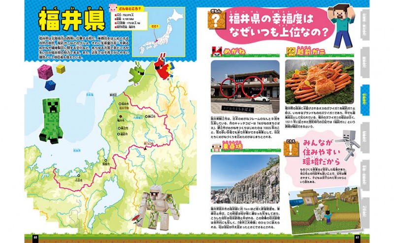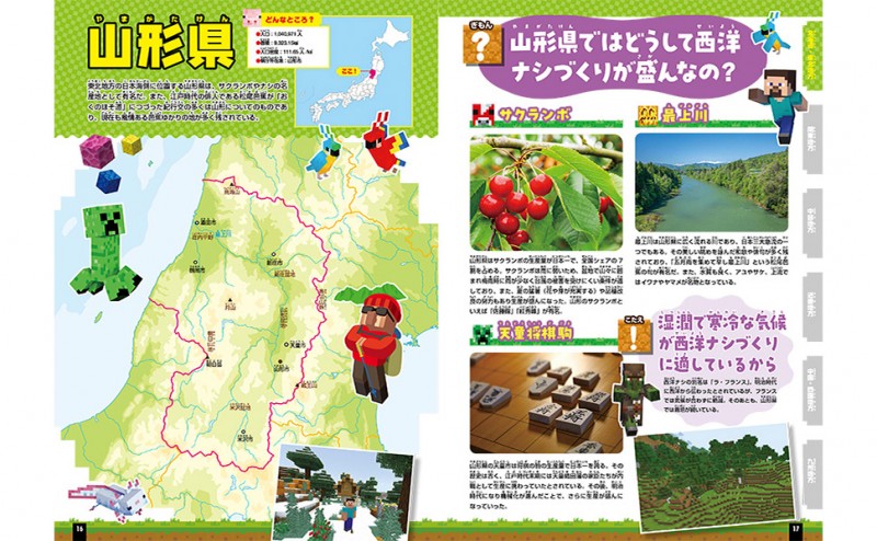 マイクラの登場キャラとともに、楽しみながら47都道府県の特徴を覚えることができます。