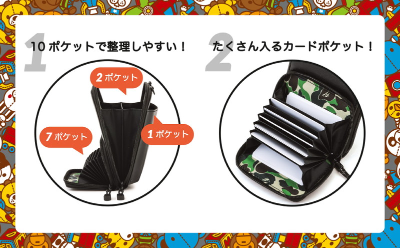 スマホポーチは、誰もが毎日使いやすいブラック。BAPE KIDSらしいカモ柄は内側にたっぷりとプリントしてあります。前面にはロゴプリント付き! じゃばら式カード入れのスロットは7カ所もあり、お財布としても超優秀です。