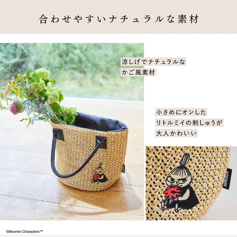 ナチュラルカラーで合わせやすく、シンプル、華やか、いろんなコーデで楽しめます。下部に小さくオンしたリトルミイの刺しゅうはさりげないかわいさで、大人の女性が持ちやすいデザイン。