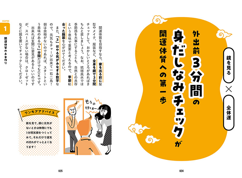 今回テーマとなっている「開運体質」になるために最も重要なのはTPOに合った身だしなみです。というのも、人は情報をまず視覚から得るからです。見た目をととのえると相手も心地よくなります。するとコミュニケーションがスムーズになり、運気の流れもよくなって、開運につながるのです。顔は家でいうと「玄関」にあたります。風水では、玄関を気の出入口として重要視し、きれいな玄関が開運には必須と考えます。同じように、他人が最初に目にする顔も、運気を大きく左右するので、スキンケアやメイクなどで誰もが心地よいと思える開運顔を目指してください。また、髪や顔など上から順番に足元まで全身をととのえるとよりいい流れになります。