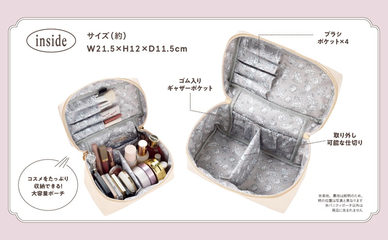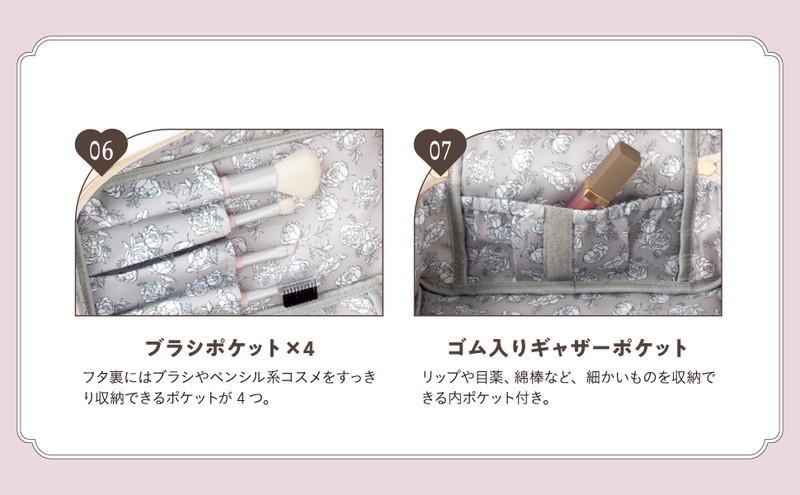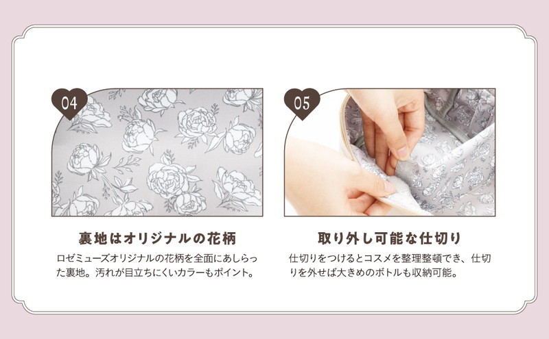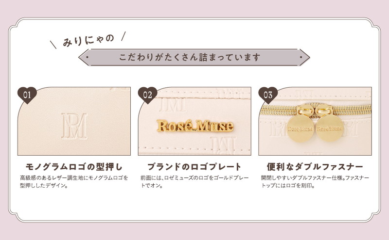 スペシャルアイテムは、大谷映美里さん完全監修の大容量バニティポーチ。Rosé Museらしいくすみピンクをベースに、モノグラム柄を型押しした高級感あふれるデザインです。かわいくてコスメもたっぷり収納できる、万能アイテムが完成しました。