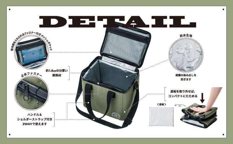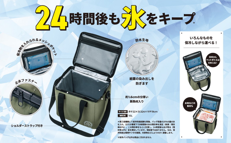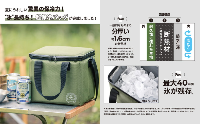 ※第三者機関にて保冷性能試験を実施。バッグ容量の25%の量の氷を入れ、25℃の環境下で8時間後の氷の残存率を測定(結果:残存率80%)。この残存率をもとに氷が完全になくなる時間を算出しています。保証値ではありません。なお、保冷性能は環境やフタの開閉、内容物などにより大きく変動します