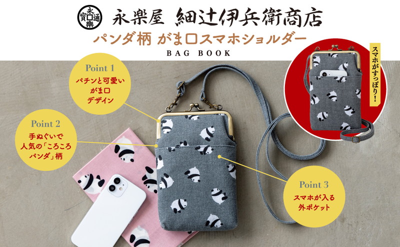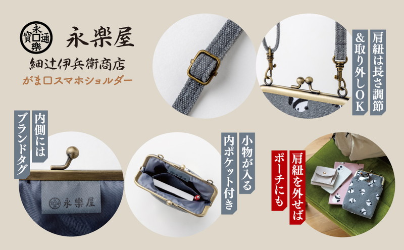 手ぬぐいで人気の京都の老舗綿布商「永楽屋 細辻伊兵衛商店」から、おしゃれで便利な、がま口スマホショルダーバッグが登場。