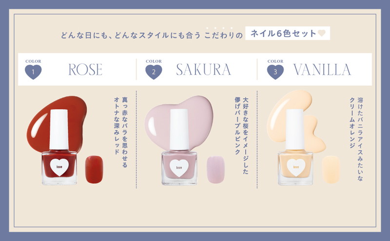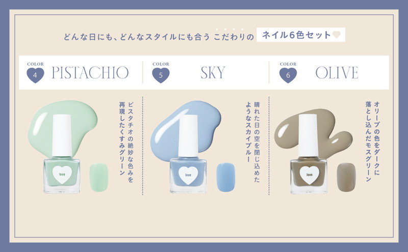 季節を問わず“一年中使えるネイル”をテーマに、絶妙なくすみカラーがおしゃれなオトナかわいい6色のネイルセットができました。