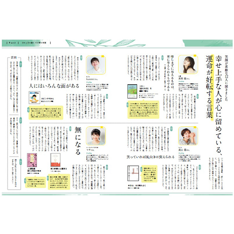人生の転機となるタイミングに心を支えてくれた言葉や、気持ちが淀んでいるときにパッと晴れやかにしてくれた言葉をテーマに一冊にまとめました。様々な世界で活躍する方々に、日々、心に留めている言葉、思い悩んだときに救ってくれた言葉を教えてもらいました。大切な言葉との出合いや、どのようにその言葉を解釈したのか、エピソードとともに解説します。人生を豊かにし、気持ちを照らしてくれる名言をぎゅっと詰め込みました。