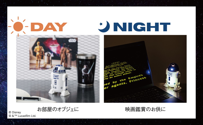 コードレスなので好きな場所で使え、昼間はオブジェとして、夜はライトとして楽しめます。ベッドサイドの明かりや、映画鑑賞のお供にも! R2-D2のお部屋ライトが、毎日の生活の相棒として活躍すること間違いなしです!