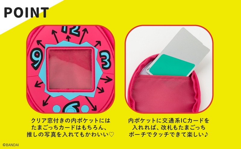 手のひらサイズのラバーポーチには内側にカードポケットがついており、付属のたまごっちカードを入れることで好きな画面のデザインに着せ替えられます。