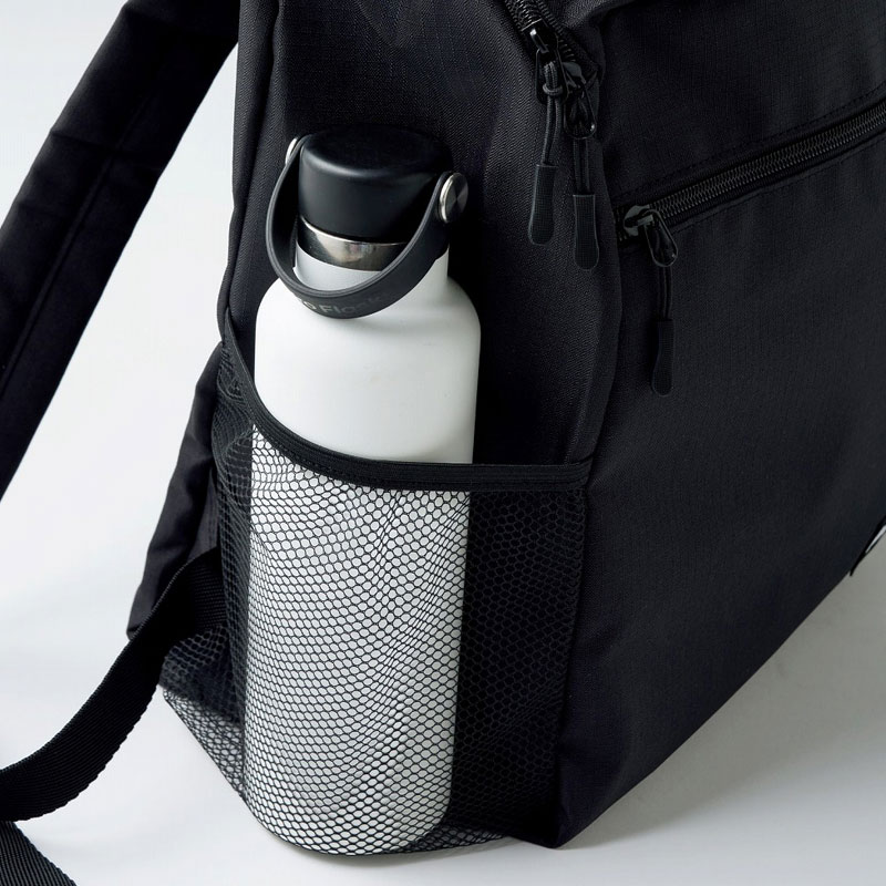 約23リットルの大容量で、両サイドには便利なメッシュポケット付き。撥水加工で少々の雨でも安心。通勤、通学はもちろん、アウトドアにも使えるアイテムです。