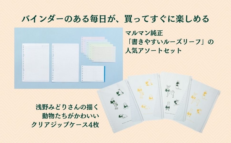 イラストレーター・浅野みどりさんの動物イラストがかわいい「クリアジップケース4枚」と、豊富なラインナップと心地よい書き味で人気の「マルマン ルーズリーフアソートセット」つきだから、手にしたその日からバインダーライフをすぐにスタートできます。