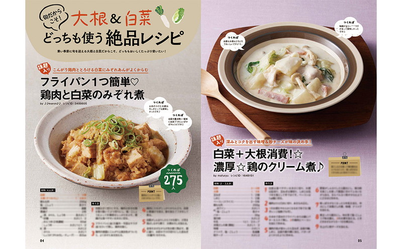 冬の食卓の常連といえば、「大根」「白菜」。大人気レシピサイト・クックパッドから、人気の大根&白菜の絶品レシピを98品ピックアップ! 値段も安く、栄養満点な旬野菜の魅力を余すところなくお届けします。つくれぽ1000人超えの殿堂入りレシピも掲載。
