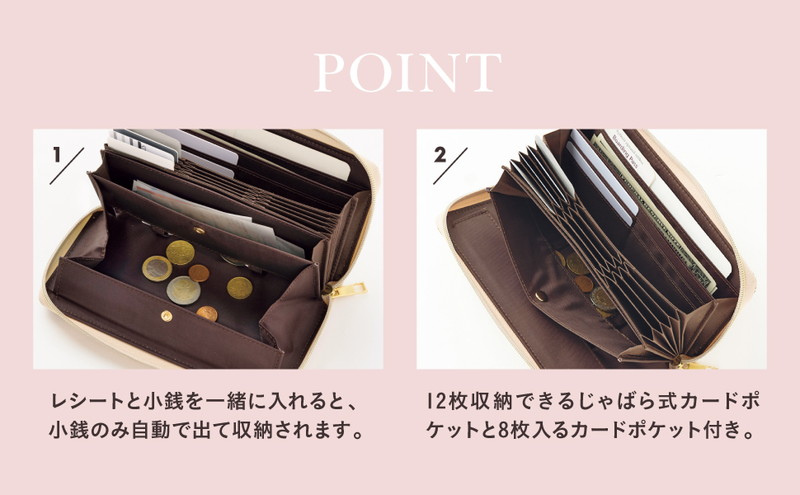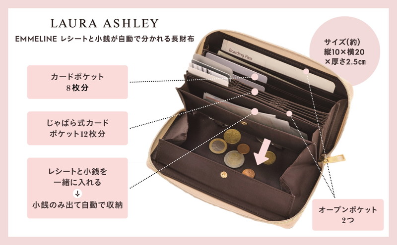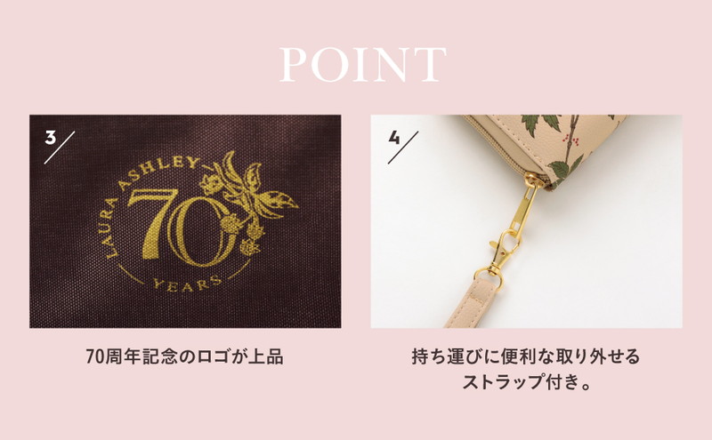スペシャルアイテムは、ローラ アシュレイのテキスタイルをあしらった、じゃばら式カードポケットが使いやすい長財布。持ち運びしやすい、着脱可能なショルダーストラップも付いています。