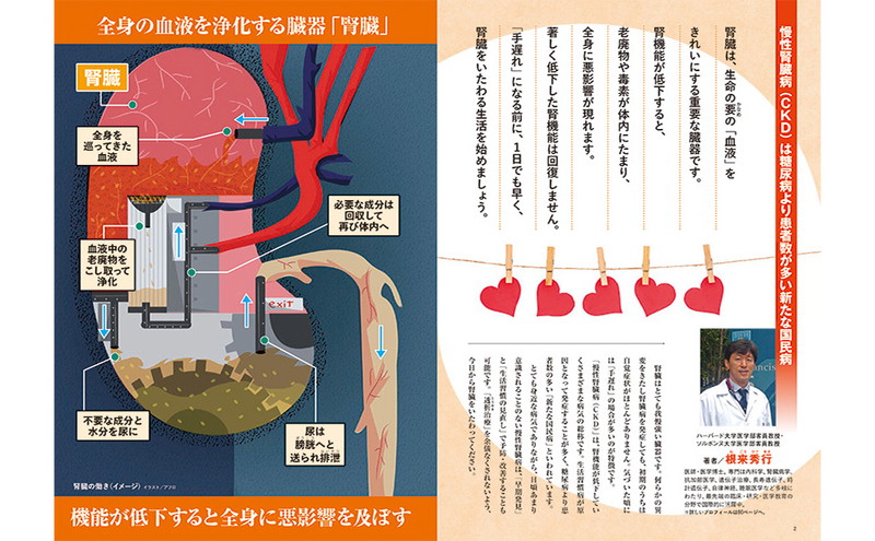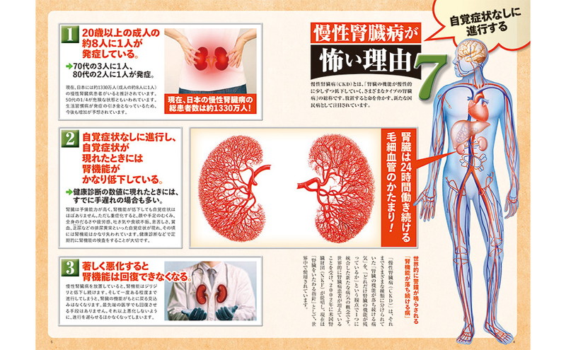国内に1330万人の患者がいるといわれる「慢性腎臓病」。50代の1/4はすでに腎臓が危険な状態だといわれていますが、沈黙の臓器といわれる腎臓は機能が30%以下になるまで症状が現れず、見つかったときにはすでに手遅れ。腎不全になると、心筋梗塞や脳卒中のリスクも大幅に高まります。本誌では腎臓の名医による最新のエビデンスからわかった腎機能を強化する食べ方、運動、生活習慣を徹底解説!