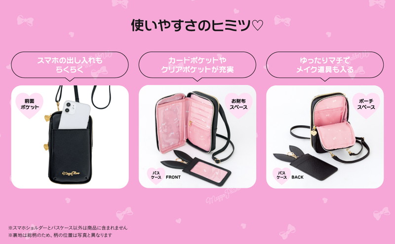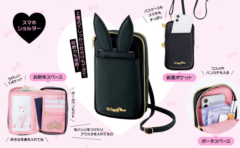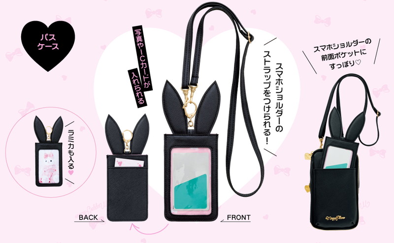 キュートな「うさみみ」つきのデザインが自慢のこちらは、見た目はコンパクトながら充実の収納スペース&推し活機能をたっぷりin。うさみみパーツは単体でも使えるパスケース! クリアポケットに推しの写真を入れても◎。