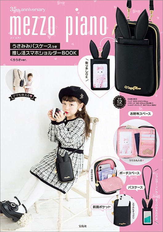 ショルダーバッグ内側の大きなクリアポケットには、アクスタから切り抜きまで何でも収納OK。ファスナーポケットはメッシュ素材なので、バッジのディスプレイもできちゃう! カードポケットや、お札や小銭用のポケットも内蔵しているので、これ一つで身軽にお出かけできるのも嬉しい。出し入れしやすい外ポケットには、スマホがキレイに入ります。金属製でキラリと輝くメゾ ピアノのロゴもポイント。こちらはおとな色のブラックカラー。