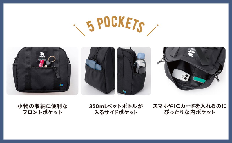 5つのポケット付きで荷物を整理整頓しやすいのがポイント。