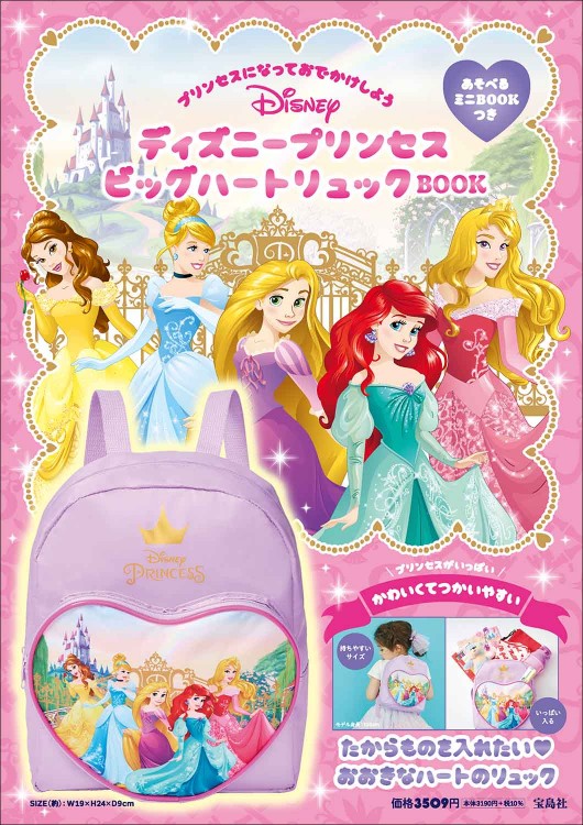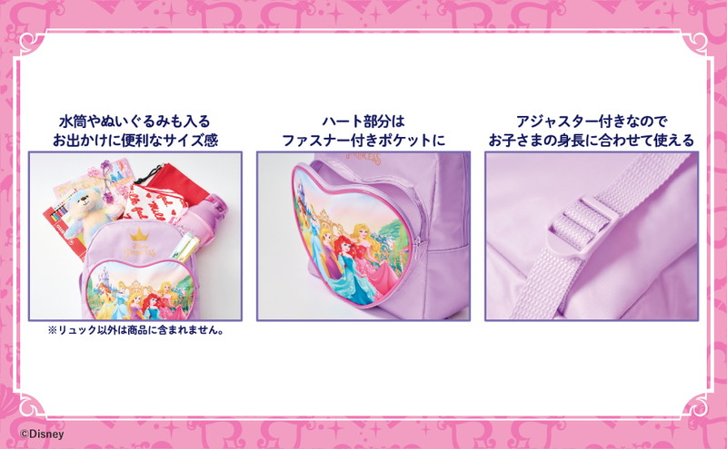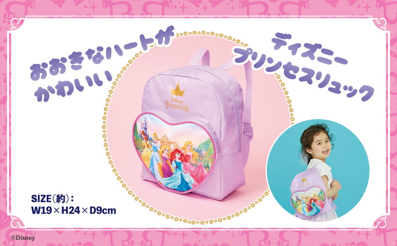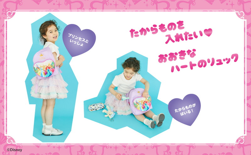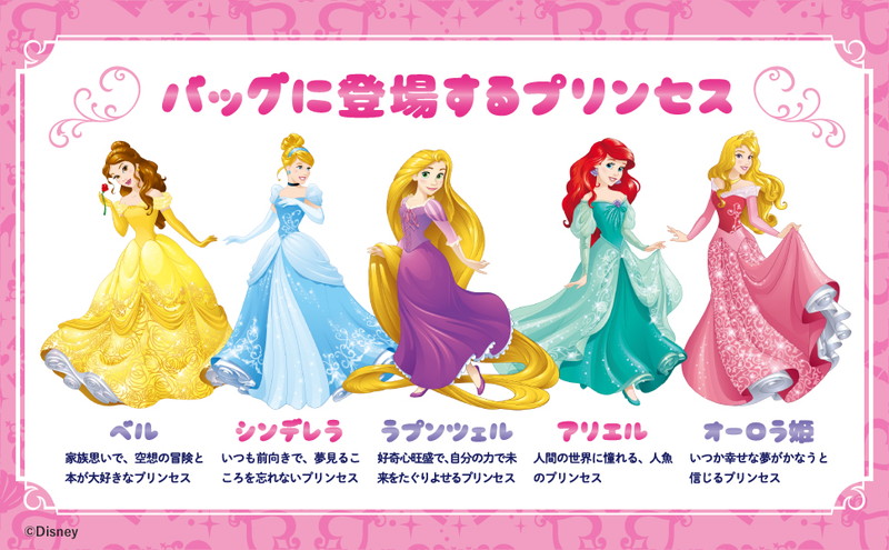 ベル、シンデレラ、ラプンツェル、アリエル、オーロラ姫の5人が彩るおしゃれなデザイン。立体的で大きなハートのポケットが特徴です。