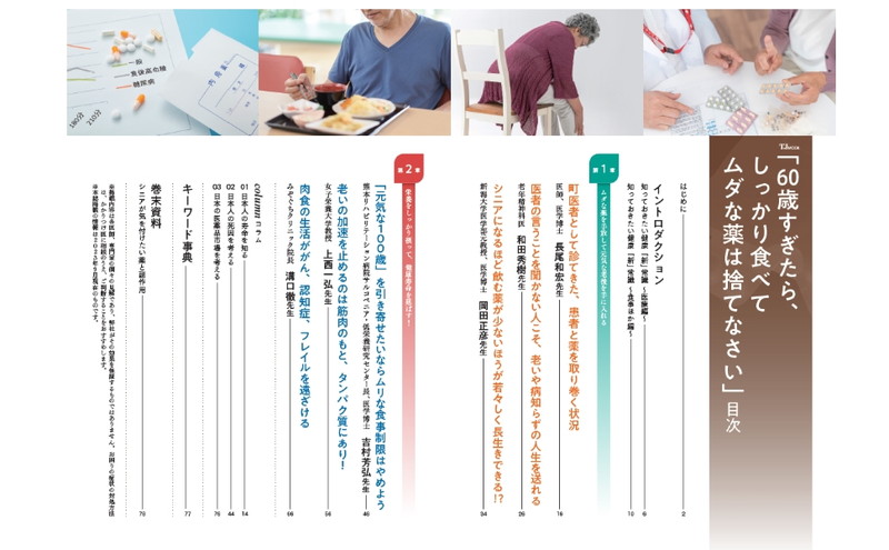 年を重ねると、飲む薬は増え、食べる量が減ってゆく生活になりがちですが、健康維持のためには、実は、逆が正解です。薬はて副作用でかえっ体にダメージを与えたり、粗食は低栄養状態になり筋力が衰え、そのまま寝たきり生活に陥ってしまうことが、いちばんこわいのです。“60歳すぎたら”、「減らすべき薬」は適切に減らし、しっかりと食べて栄養をつけることが肝心です。