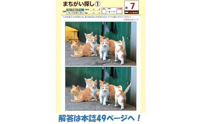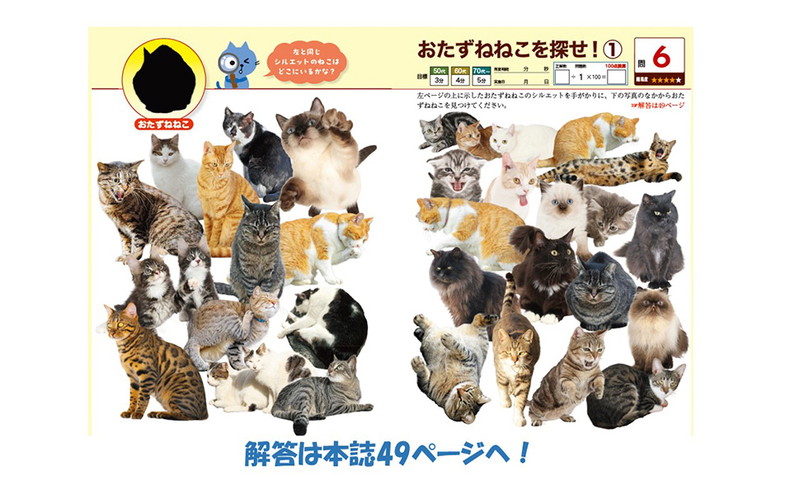 ねこの可愛い写真やイラストを使った、「まちがいさがし」や「おたずねねこ探し」「迷路」「イラスト漢字」など、可愛いにゃんこが満載の脳トレ問題を多数掲載!!
