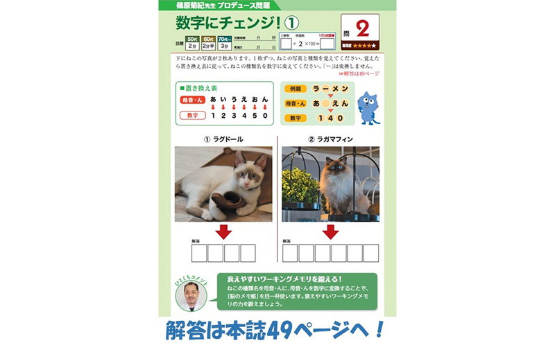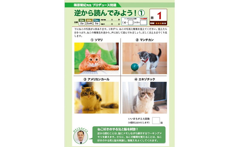 また脳科学者・篠原菊紀先生のねこプロデュース問題も! 癒やされながら、もの忘れ・認知症を予防できる一冊です。