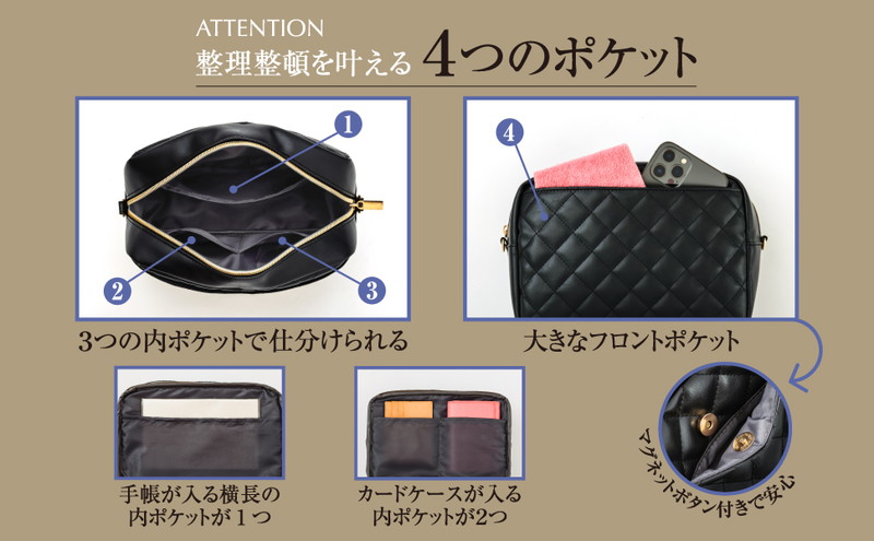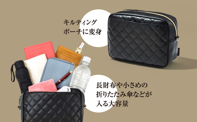 ブランドBOOK第2弾のスマホショルダーで好評だった合皮キルティングを採用し、高級感たっぷりなゴールドの金具にブラックの生地で仕上げました。