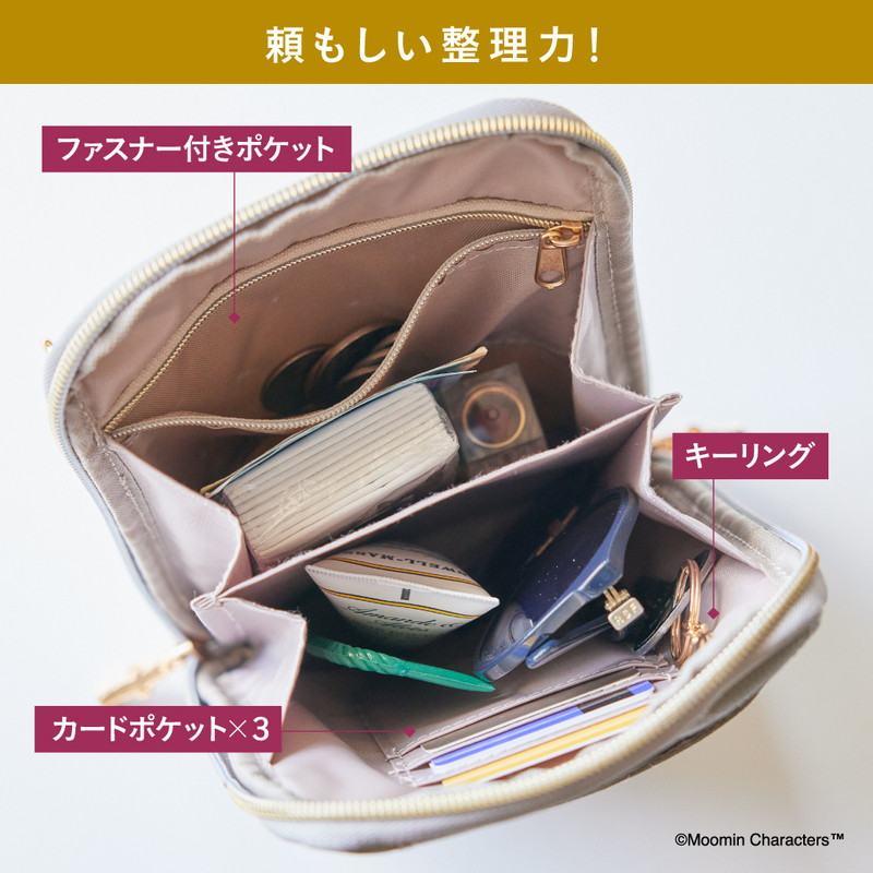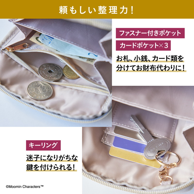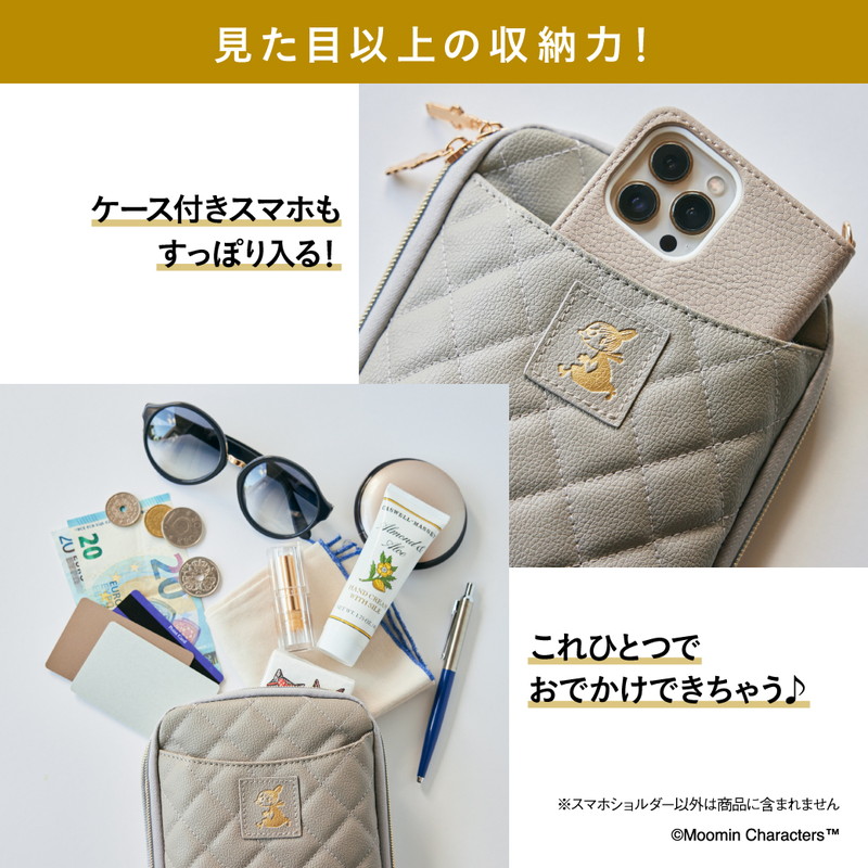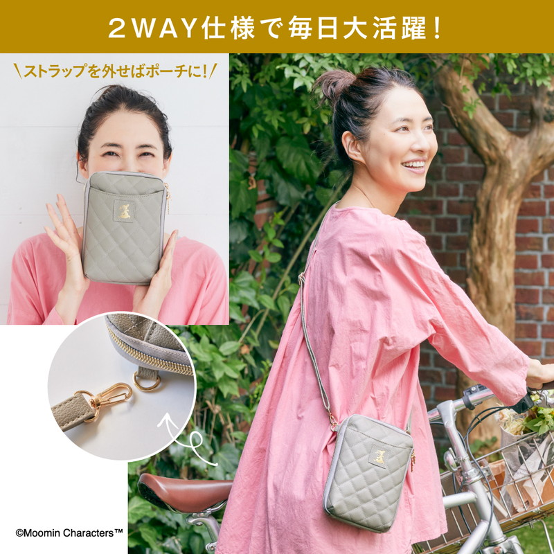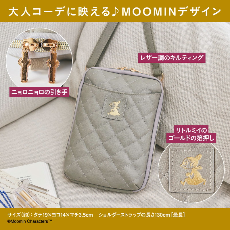 絶妙な色みでおしゃれ上級者に見せてくれるグレージュのレザー調のキルティングに、リトルミイのゴールドの箔押しが上品なアクセント。ニョロニョロの引き手などさりげないムーミンデザインがしゃれ感をプラスしています。ショルダーストラップは長さ調節&取り外しが可能で、外すとポーチとしても使える2WAY仕様。毎日大活躍すること間違いなしのアイテムです。