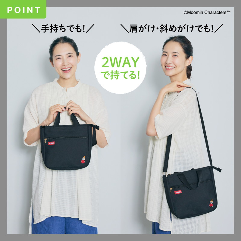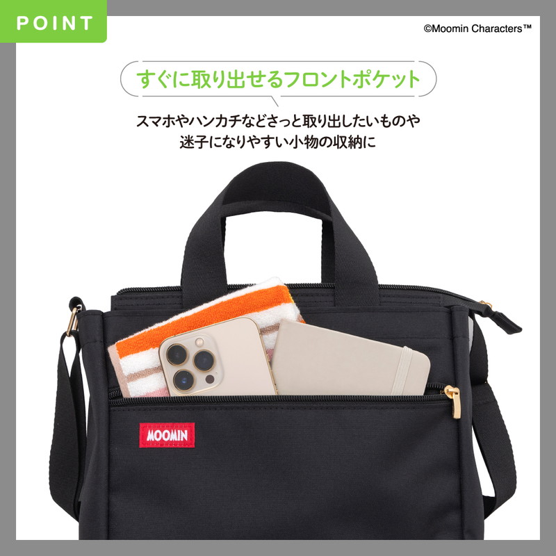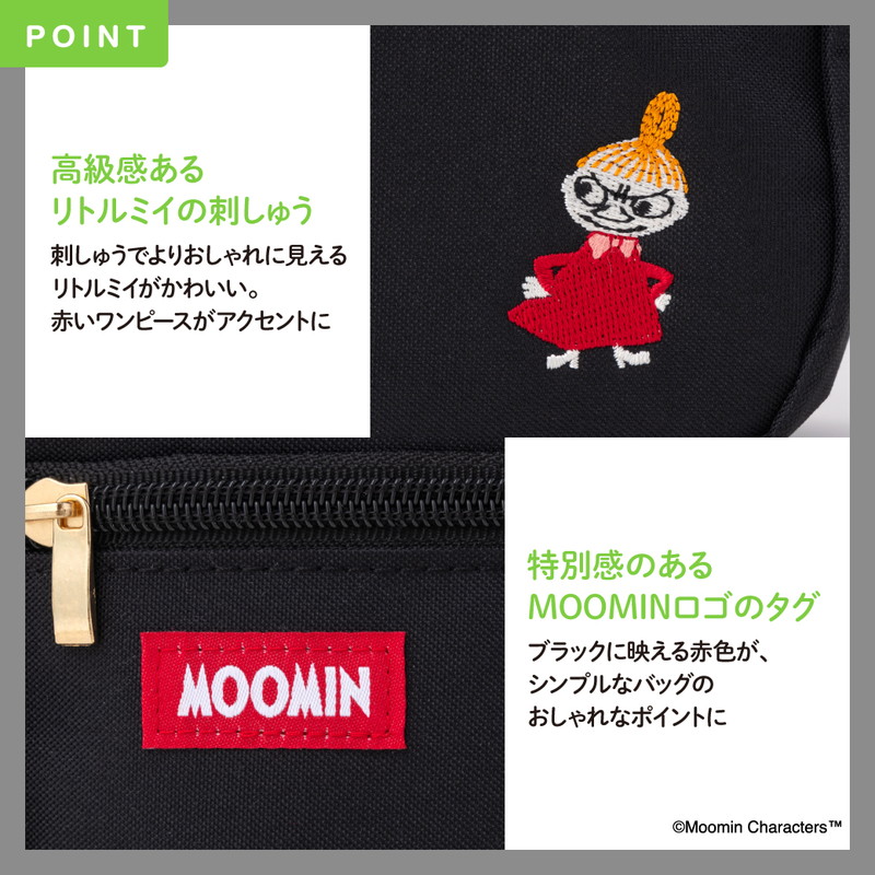 高級感のあるリトルミイの刺しゅうや、赤色のMOOMINロゴのタグがシンプルなバッグのポイントに。
