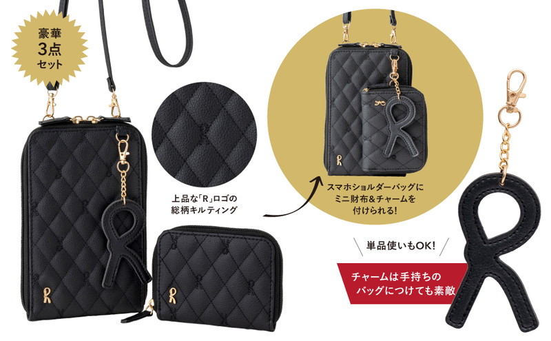 アイテムはスマホショルダーバッグ、同柄のミニ財布、チャームの豪華3点セット!