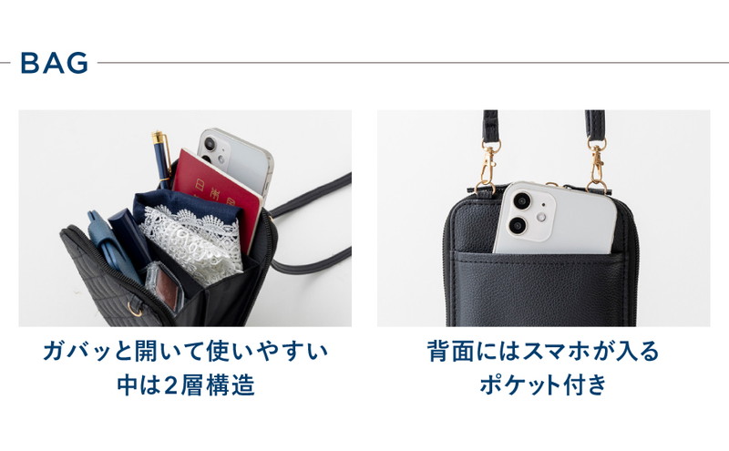 スマホショルダーバッグはがばっと開く2層構造で見た目以上の収納力。