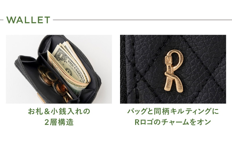 レザー調素材に「R」ロゴ入りのキルティングを施した、品のあるリッチなデザイン。