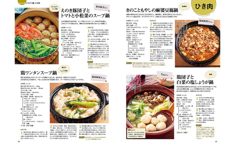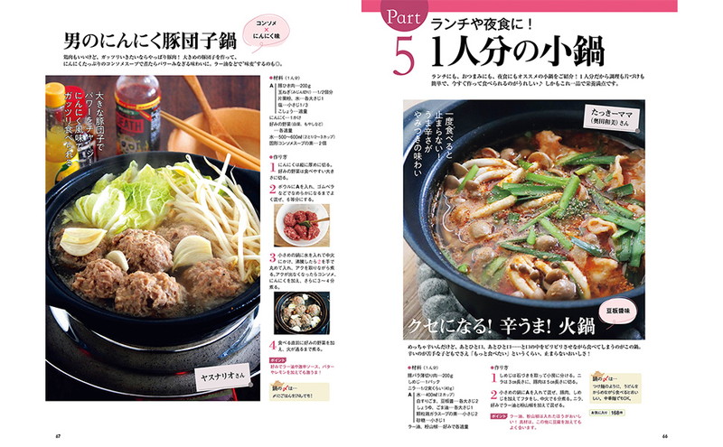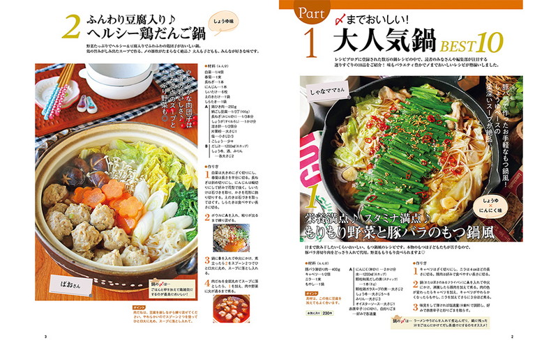 レシピブログで人気のおいしい鍋レシピを一冊にまとめました。作るのが簡単、食材もたくさんとれて栄養満点の鍋ですが、意外とレパートリーが限られていて“同じ鍋”になりがち。定番、韓国風、ヘルシー系、一人分の鍋、子どもと楽しむ鍋、〆も楽しむ鍋など、バラエティに富んだレシピを知ることで、毎日でも飽きずに食べられます。「小鍋」レシピもあるので、一人ランチ、夜食など一日のごはんでいつでも活用できる内容です。