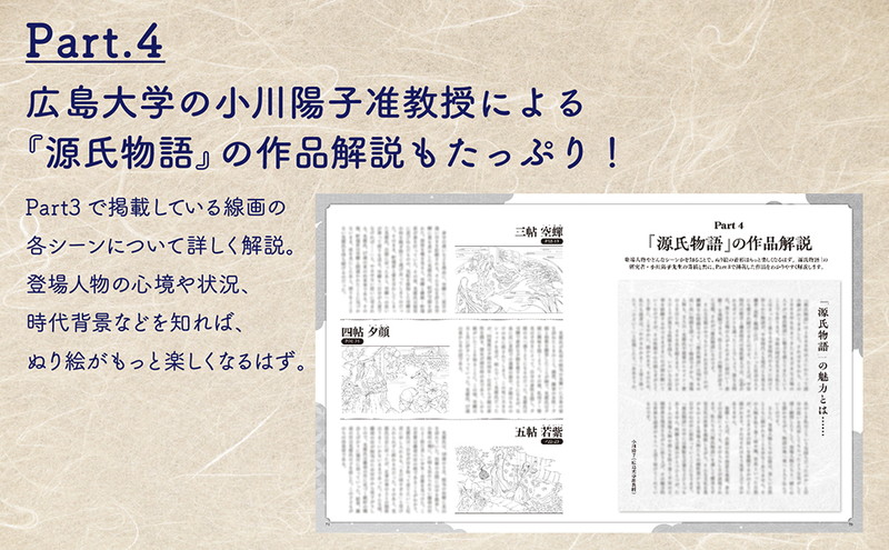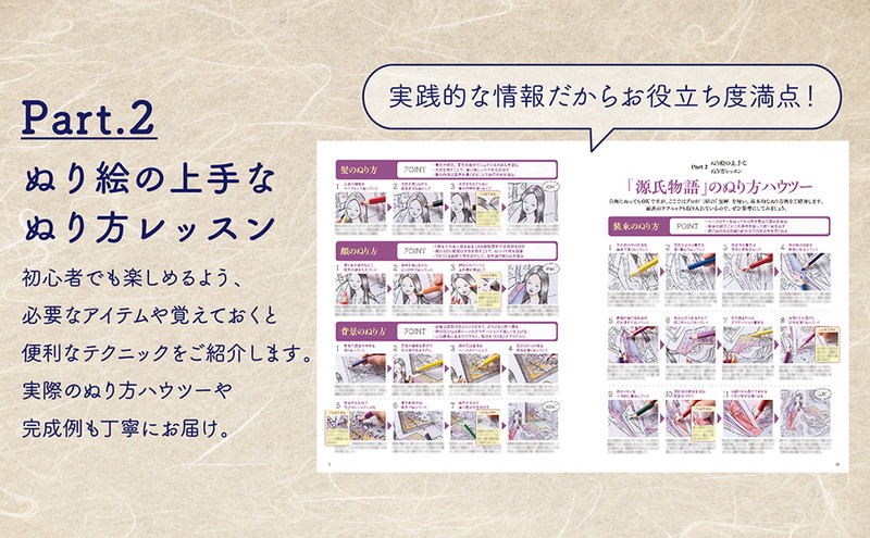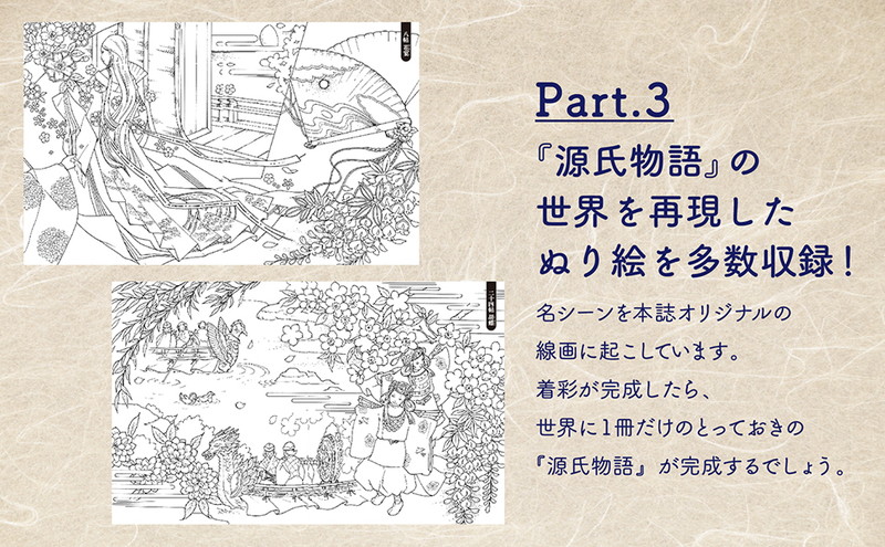 華麗なる平安時代の世界が楽しめる、大人のための「源氏物語ぬり絵」が登場。美しく華やかな源氏物語のシーンを想像しながら、自分だけのオリジナル源氏物語絵巻が作れます。巻頭ページでは着色のお手本を掲載。十二単や花柄、和柄などの細かい塗り方や、本格的に仕上げるポイントもレクチャー。そのほか、日本の伝統色、源氏物語のあらすじや登場人物の解説ページもあるので、ぬり絵を愉しみながら平安時代の文化に関する教養も深まる一冊です。