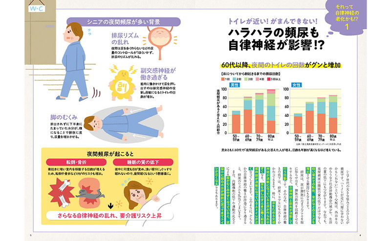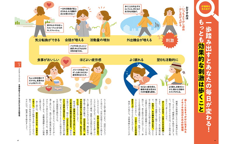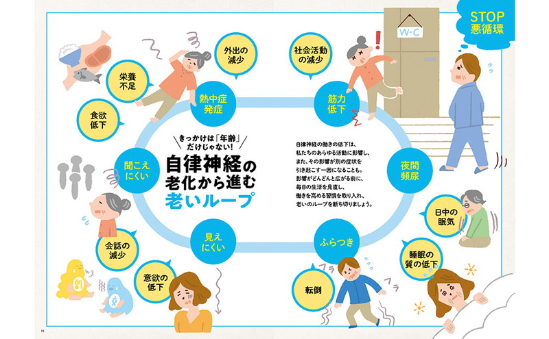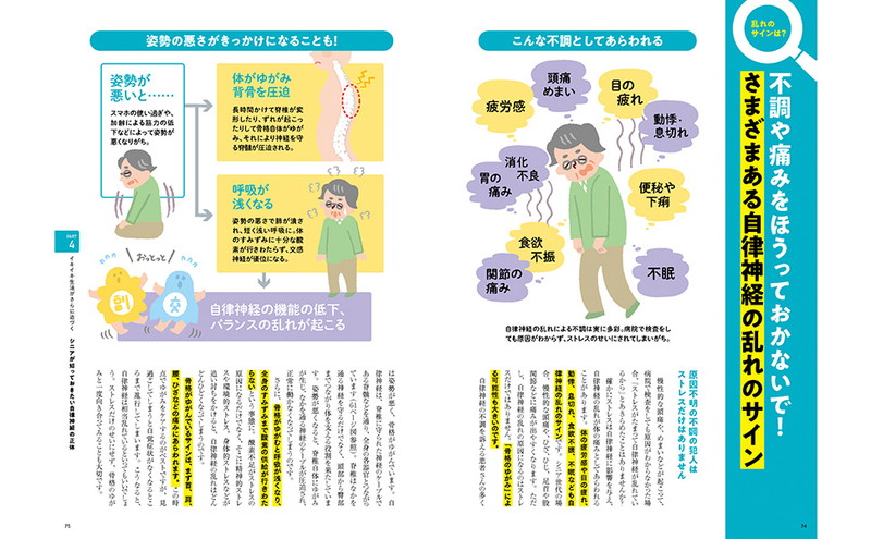 知っているようで知らない自律神経について、特にシニア世代が知っておきたいことを図版とともに徹底解説します。体のだるさや不眠、発汗、ほてり、動悸、めまい、頭痛などの症状や、疲れやすい、季節の変わり目で体調を崩しやすいのは、自律神経の老化が原因かもしれません。そこで、自律神経を整える生活習慣や軽い運動など、いきいき暮らすヒントを紹介します。