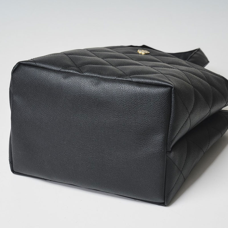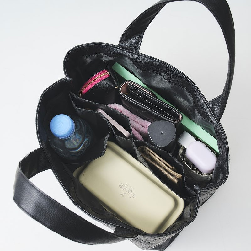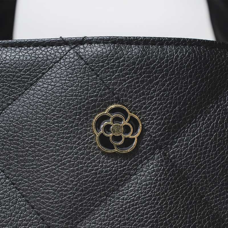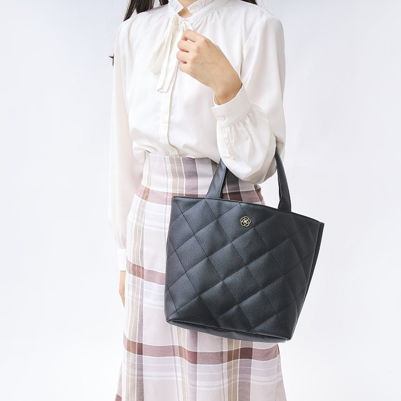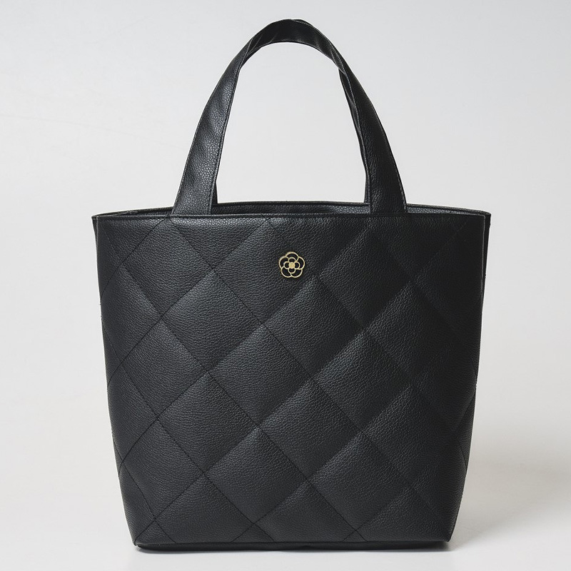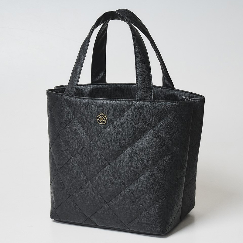 今回は大人っぽいブラックカラー。ワンポイントのカメリアと合皮キルティングで、高級感のあるデザインに仕上げました。5つのポケットがついているので、バッグ内の整理整頓も簡単にできます。年齢やシーンを問わず使えるアイテムです。