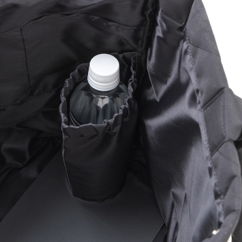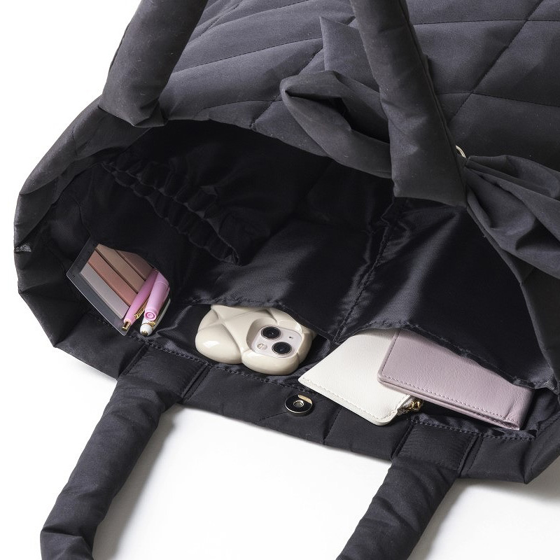 かわいらしいリボンがあしらわれたふかふかのキルティングバッグは、好きなチャームを付けられるDカンのほか、3つの内ポケットやボトルホルダーなど細部へのこだわりが光るアイテム。