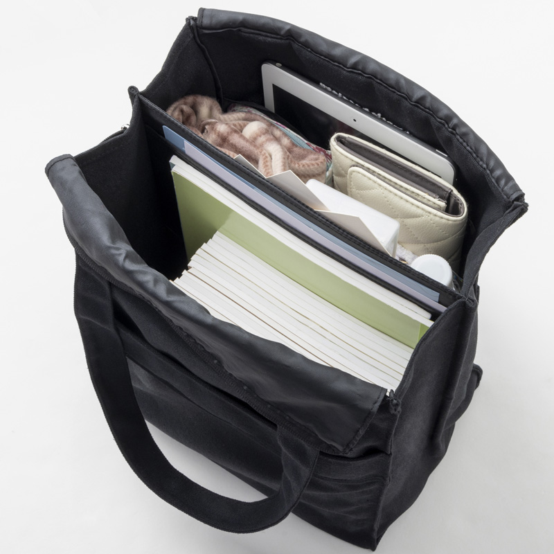 A4がゆとりを持って入るため、大きめの本やクリアファイルもゆがまず入れられます。