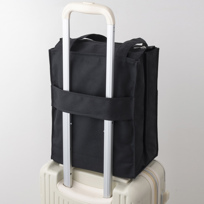 裏面にバンドが付いているため、キャリーバッグのバーに取り付けが可能。