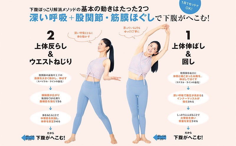 効果が上がる基本の動きとして1セット1分「上体伸ばし&回し」「上体そらし&お腹ねじり」からスタート!