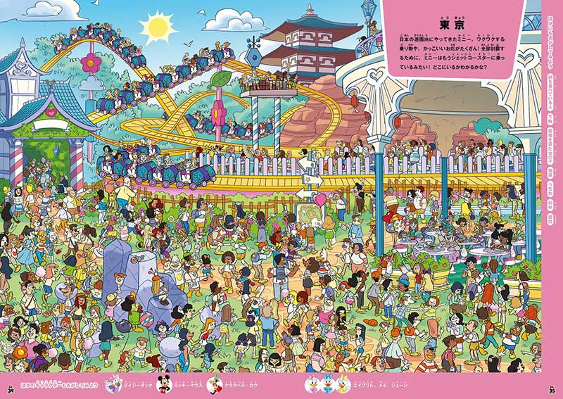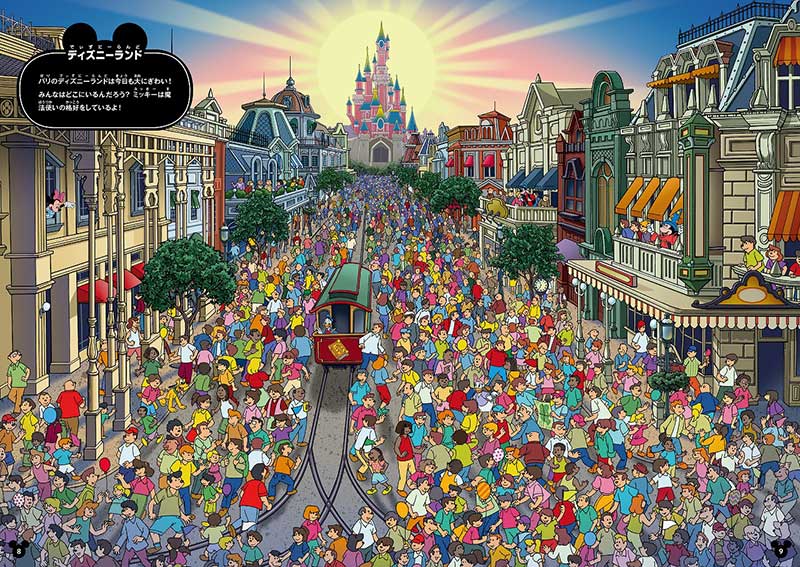 すべての場所にミッキー、ミニー、ドナルド、デイジー、プルート、グーフィーのほか、おなじみのディズニーキャラクターたちもたくさん登場するにぎやかな一冊。