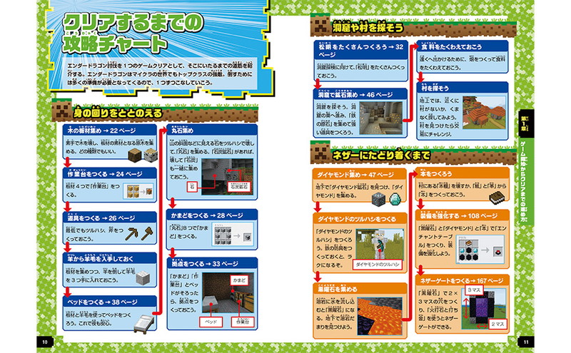 桜バイオームやラクダといったアップデートにも対応し、新しい動物の繁殖方法も掲載。素材リスト、設計図付きの建築、レッドストーン、コマンドの使い方などマイクラの全てがわかる一冊です。