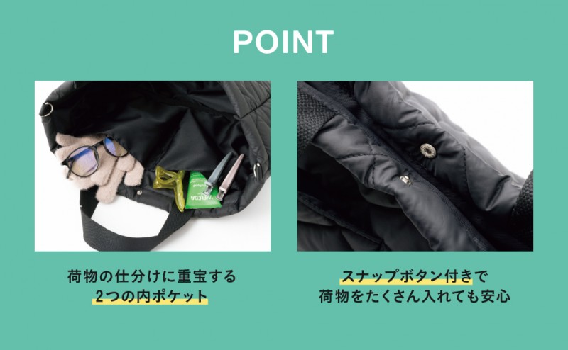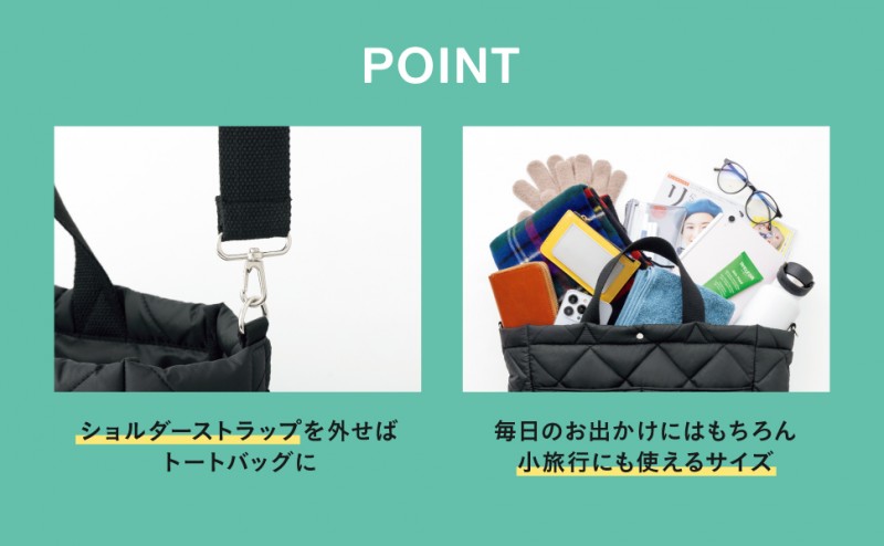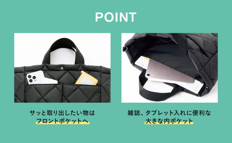 手持ち&肩掛けの2WAY仕様で、使いやすさにとことんこだわりました。シンプルながらシルエットにもこだわったおしゃれなキルティングバッグは、どんな着こなしにもハマる万能アイテムです。
