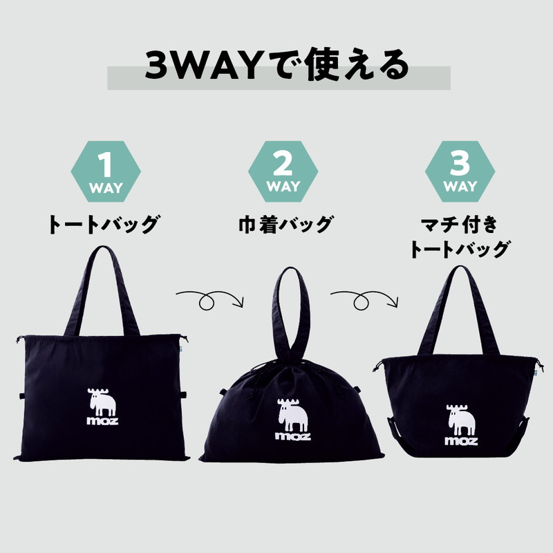 【1】 トートバッグ 【2】巾着バッグ 【3】マチ付きトートバッグの3WAY仕様で、用途に合わせて変形できる優秀バッグ。