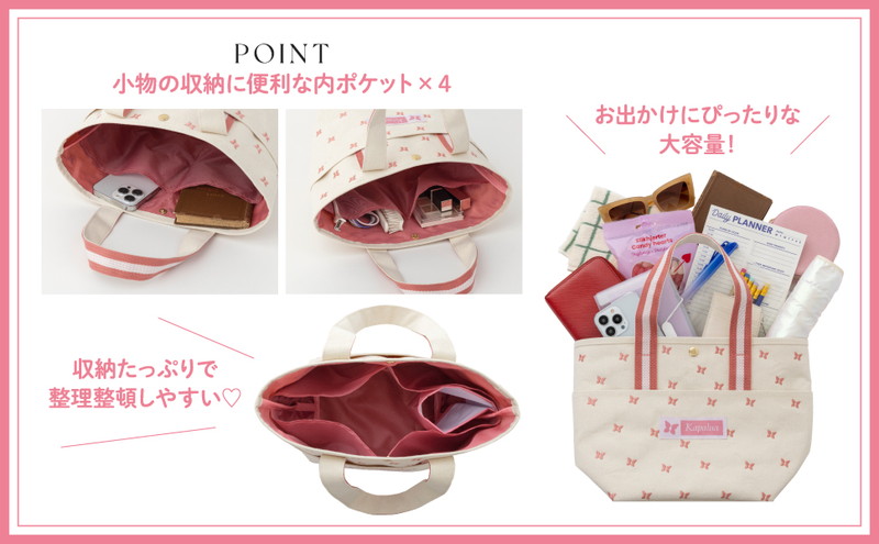 内側には全部で4つのポケットを用意。こまごました荷物もすっきり整理整頓できるのがうれしいポイント。