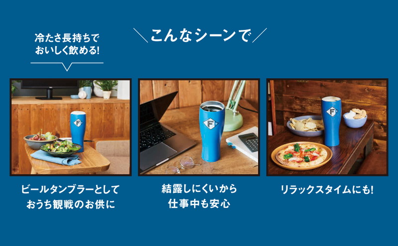 ファイターズブルーのタンブラーに球団のシンボルマークが映えるクールなデザインです。真空断熱構造で保冷保温効果があり、ビールやコーヒーの飲みごろ温度を長時間キープできます。おうちでの野球観戦のほか、デスクワークやリラックスタイムにもおすすめ!