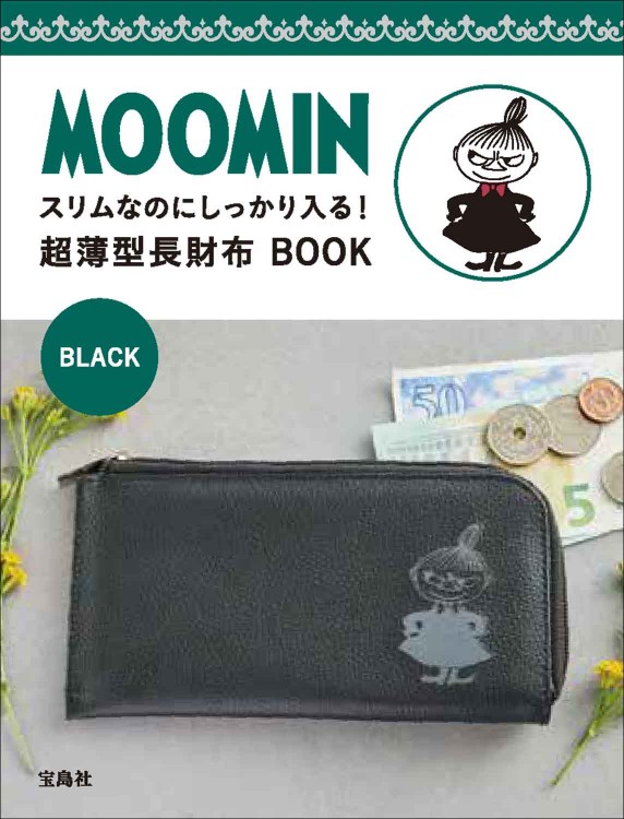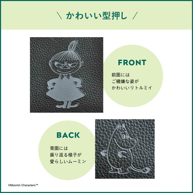 とっても薄いのに、収納力と機能性をしっかり備えたムーミンの長財布が登場です。高見えするリッチなレザー調の生地に、カラーはどんなシーンにもなじむ大人のブラック。一見シンプルですが、前面には立ち姿がかわいいリトルミイ、背面には振り返る様子が愛らしいムーミンの型押しがポイントに。長方形でつまみやすい引き手は、スタイリッシュな印象のシルバーになっています。