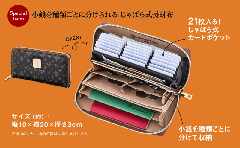 スペシャルアイテムは機能性にこだわった長財布。使いやすいと口コミ人気が高い縦型3列のじゃばら式カードケースや、小銭を種類ごとに分けられる仕切り付きコインケースを内蔵しました。